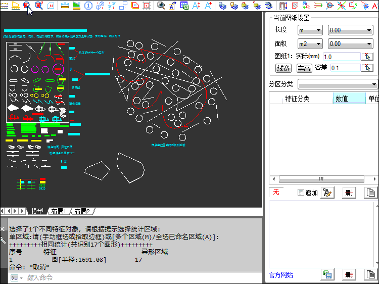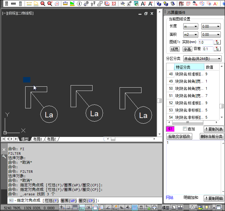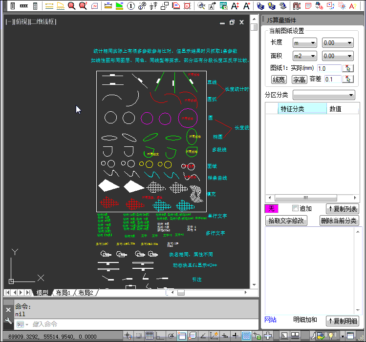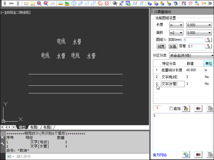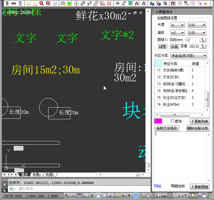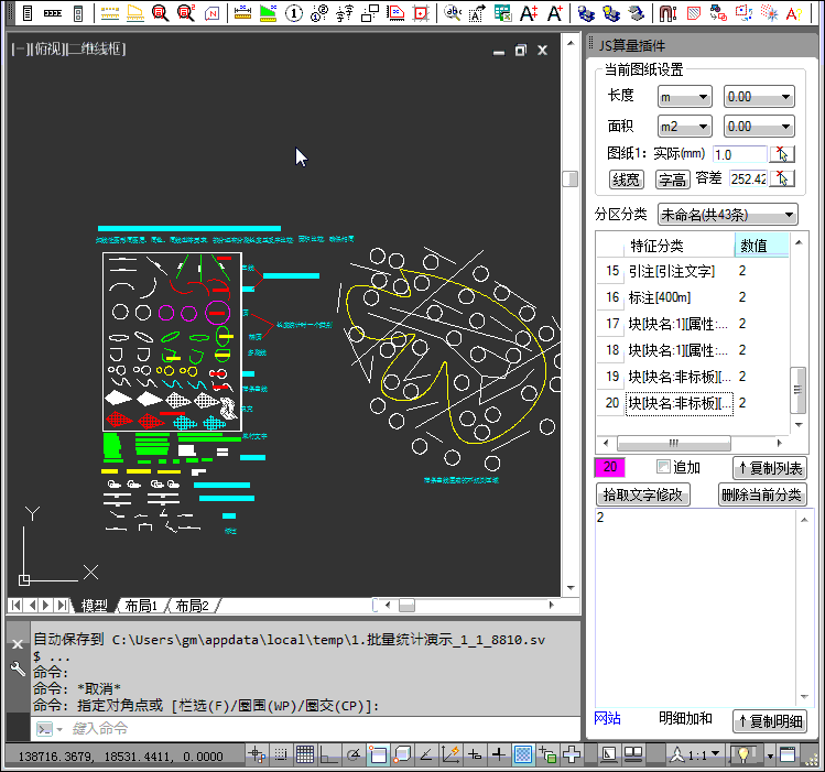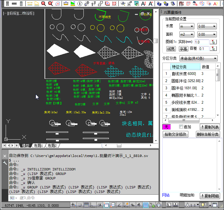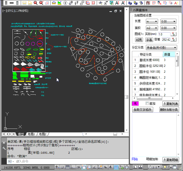 已选模式智能分类直接出统计结果 特征模式完全相同(如图层/颜色/长度/面积/段数/样式/属性等等) 支持类型曲线、块、文字、标注、填充、面域等全部类型都可以统计相同 |