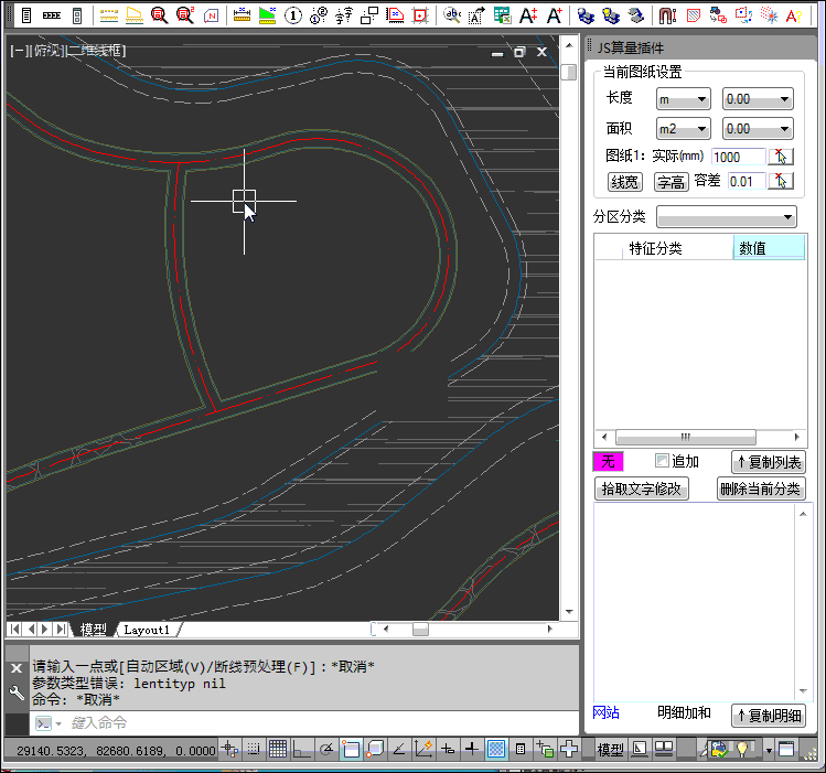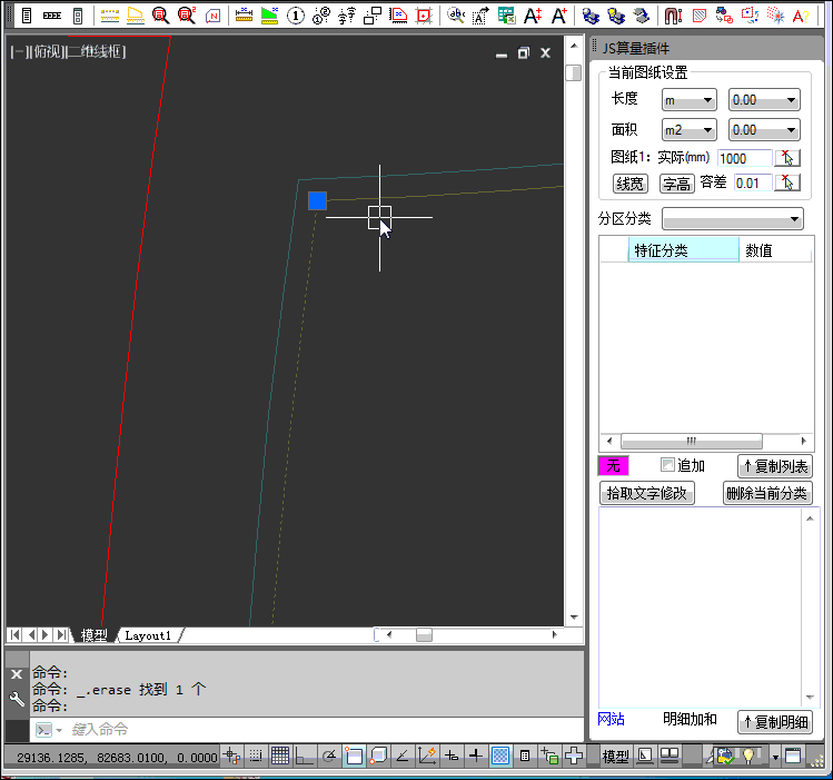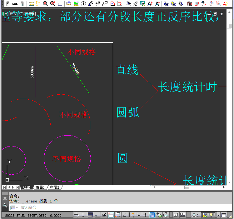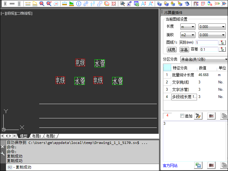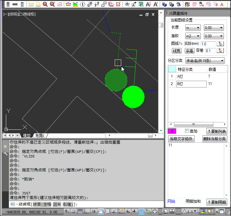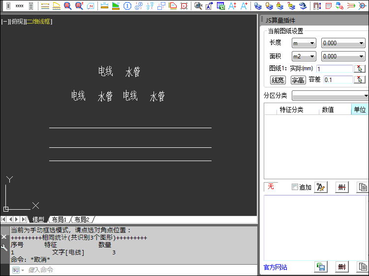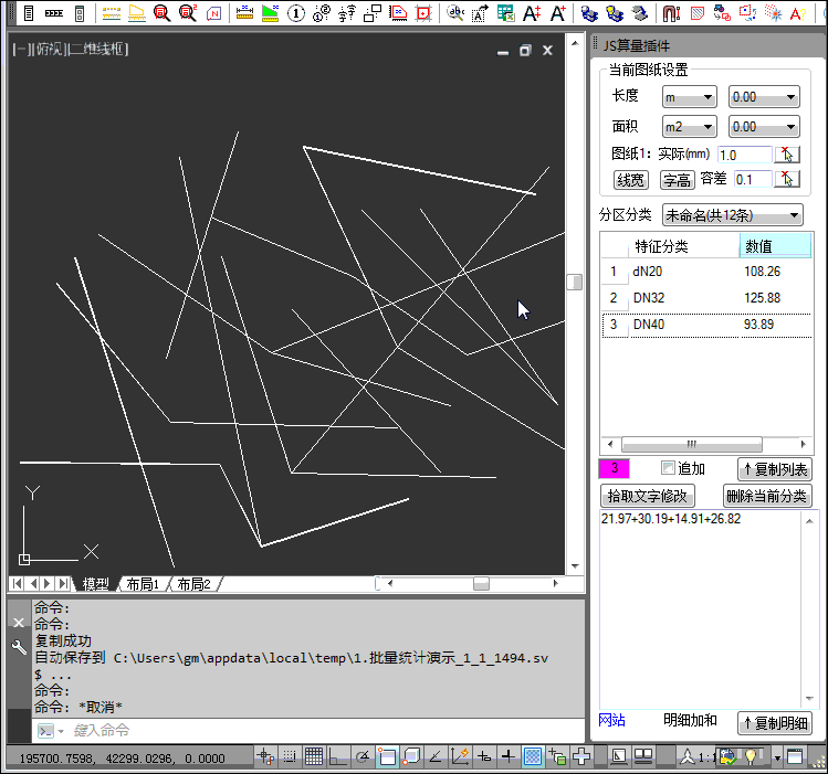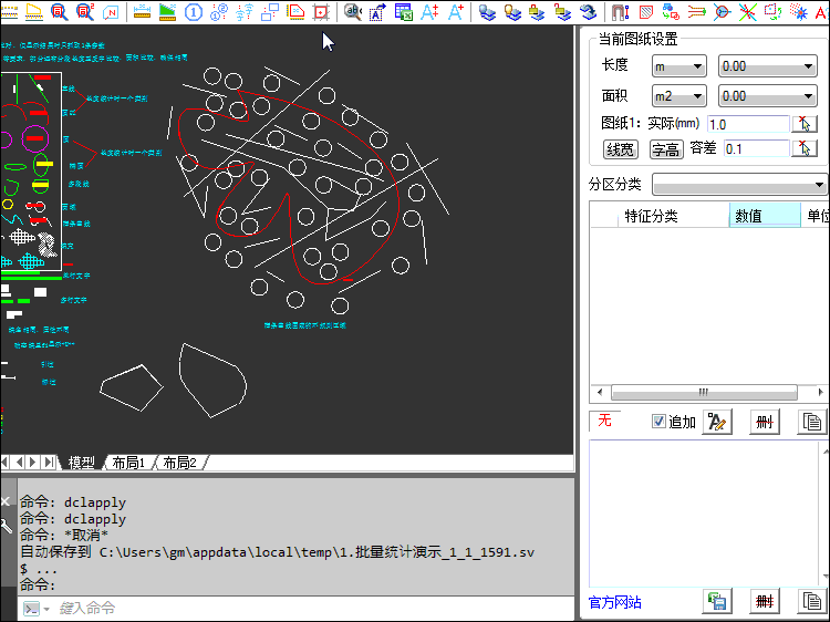 已选模式智能分类直接出统计结果 特征模式完全相同(如图层/颜色/长度/面积/段数/样式/属性等等) 支持类型曲线、块、文字、标注、填充、面域等全部类型都可以统计相同 |