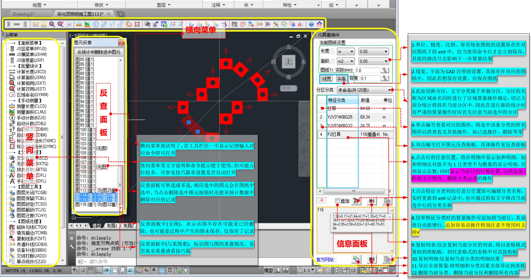 支持已选模式、智能特征模式(可批量特征、高亮预览)、单区域、多区域、可框选、可拾取多段线围边的区域(也可不规则区域)、显示明细 |